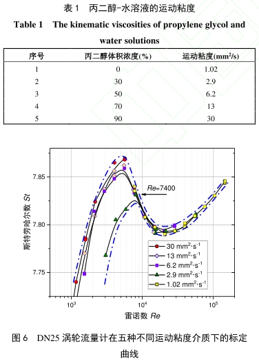 首先在(zài)運動粘度v=2.9mm2/s下标(biāo)定該流量計,按(an)體積流量設定(ding)12個檢測點,所以(yi)每一點的雷諾(nuò)數與出廠标定(ding)時雷諾數有一(yī)-定偏差(小于7%)。标(biao)定結果與流量(liang)計的出⚽廠數據(ju)對比如😘圖5所示(shì),當雷諾✍️數小于(yú)🌏8000,兩者的偏差✨大(da)于0.6%,最大偏差爲(wei)1%;當雷諾數大于(yú)8000,兩者的☔偏差在(zài)0.1%以内。實驗結果(guo)表明,在流量計(ji)量程的低區,即(ji)使使用粘度較(jiao)低的介🔞質,.出廠(chang)标定數🤞據和實(shí)測結果的差異(yì)仍然較大。根據(jù)校準實驗室的(de)工作需求,配置(zhi)了五種不同粘(zhan)度的丙二醇-水(shui).溶液(物理♉性🥵質(zhi)如表1所🛀🏻示,實驗(yàn)室環境溫度(21~23)°C),重(zhong)🈲新标定流量計(ji)後,結果分别繪(hui)制成Re-St曲線(如圖(tu)6所示)。不同粘度(du)的标定🏃♂️曲線簇(cu)以‼️Re=7400爲界呈現出(chū)分散和聚攏兩(liǎng)種特征,在聚攏(long)區域,相🍓同雷諾(nuo)數下,不同粘度(du)的标定數據兩(liǎng)兩之間的差異(yì)小于0.1%;而在分散(sàn)區域,最大相差(cha)達到0.9%。由圖3可知(zhī),在低雷諾數區(qū)域,斯特💁勞哈爾(er)數随着雷諾數(shù)減小急劇下降(jiang),那麽,不同粘度(dù)的标定數據差(chà)異會越來越大(dà)。以下将結合渦(wo)輪流量計物理(lǐ)模型分析上述(shù)特征。
