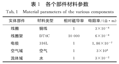 有限(xiàn)元網格(gé)的質量(liang)直接影(ying)響計算(suan)精度,采(cǎi)用自動(dòng)網格劃(huà)分,單元(yuan)形狀爲(wèi)四面體(ti),粗網格(ge)和細網(wǎng)格之間(jian)過渡并(bìng)不光滑(huá),因此将(jiāng)流體域(yu)和空氣(qi)域之間(jiān)的測量(liàng)管域的(de)網格單(dān)元大小(xiao)設置爲(wei)2mm。網格劃(huà)分後,導(dǎo)入Anrsys中進(jin)行單元(yuán)類型、材(cái)料、實常(cháng)數、載荷(he)、邊界條(tiáo)件和場(chǎng)路耦合(he)單元設(shè)置。線圈(quan)用銅線(xian)實現,匝(zā)數共6500匝(za),其截面(miàn)積爲2.72×10-4:mm²,體(ti)積爲1.49×10-5mm3;線(xian)圈坐标(biāo)系單獨(du)定義爲(wei)局部柱(zhù)坐标系(xi),軸向爲(wèi)正Y方向(xiang),其餘部(bù)件的坐(zuo)标系使(shǐ)用全局(ju)笛卡爾(er)坐标系(xi),軸向爲(wèi)正Y方向(xiang)。各個部(bu)件的材(cai)料參數(shù)設置見(jiàn)表1。