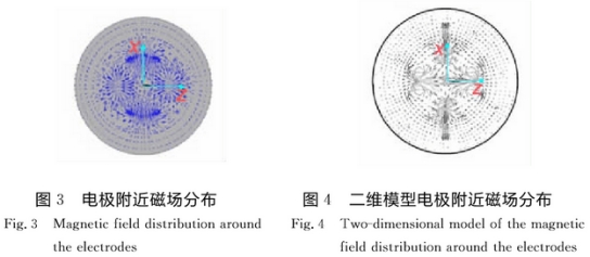 爲了保(bǎo)證模型(xíng)的正确(què)率,對建(jian)立的四(sì)電極外(wai)流式電(diàn)磁流量(liang)傳感器(qi)的三維(wei)有限元(yuán)模型,從(cong)2個方面(miàn)進行了(le)校驗:首(shǒu)先,給有(you)限元模(mó)型施加(jiā)恒值電(diàn)流激勵(li),選用靜(jìng)态求解(jiě)類型,将(jiang)模型最(zui)外圈節(jiē)點的Ax,Ay,Ax自(zì)由度均(jun1)設爲0,選(xuan)擇所有(yǒu)單元後(hou)進行求(qiu)解,然後(hòu)在後處(chu)理器中(zhong)讀入結(jie)果,畫出(chu)電極附(fù)近的磁(cí)場;分布(bù),如圖3所(suǒ)示,磁場(chǎng)分布符(fú)合金甯(ning)德等數(shù)值分析(xi)的結果(guo)'5],如圖4所(suo)示;其次(ci),在現有(yǒu)模型基(jī)礎上加(jiā)密網格(ge)單元,所(suo)得感應(ying)電動勢(shì)大小前(qián)後誤差(cha)小于5%,從(cong)而保證(zhèng)有限元(yuan)計算結(jié)果不受(shòu)網格質(zhì)量變化(hua)的影響(xiǎng)。綜上所(suo)述,該有(you)限元模(mo)型是準(zhǔn)确的,可(kě)用來進(jin)行仿真(zhen)研究。