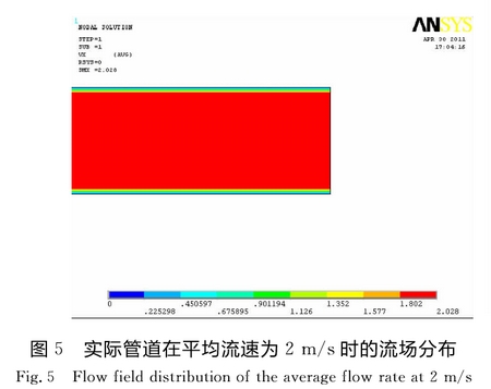因(yīn)此,當管(guan)道内平(ping)均流速(su)V>0.092m/s時,管道(dao)内的流(liu)動狀态(tài)爲紊流(liu);事實上(shang),四電極(ji)外流式(shì)電磁流(liú)量計在(zai)工作的(de)時候,管(guan)道内大(da)多數的(de)流動速(sù)度都大(dà)于這個(ge)值。當管(guǎn)道内的(de)流動狀(zhuang)态爲紊(wen)流時,用(yòng)CFD軟件進(jin)行流場(chang)分析、計(jì)算,通過(guò)CFD模拟,可(ke)以分析(xi)并且顯(xian)示流體(tǐ)流動過(guò)程中發(fā)生的現(xian)象,及時(shi)預測流(liú)體在模(mo)拟區域(yù)的流動(dòng)性能[10],用(yong)有限元(yuán)軟件Ansys中(zhōng)的FLOTRANCFD模塊(kuai)對其流(liu)場進行(háng)仿真分(fen)析,計算(suàn)結果如(ru)圖5所示(shi)。