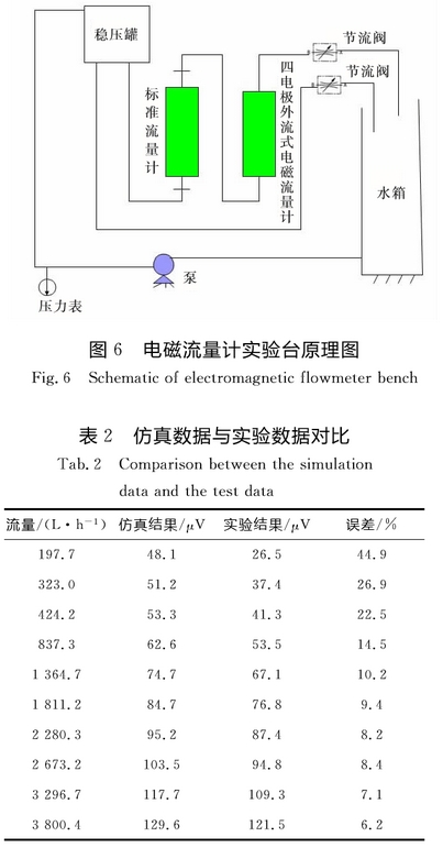 在紊流(liu)場共選(xuan)定了10個(ge)不同的(de)流量值(zhí),獨立電(diàn)壓源編(biān)程爲兩(liǎng)值矩形(xíng)波,幅值(zhí)爲15V,頻率(lǜ)爲1Hz,對流(liú)量數據(ju)進行了(le)仿真計(ji)算,并在(zài)實驗台(tai)上得出(chū)了實驗(yàn)數據,實(shí)驗台采(cǎi)用精度(du)爲0.5%的電(diàn)磁流量(liàng)計讀取(qǔ)流量值(zhi),用信号(hao)處理電(diàn)路采集(jí)四電極(jí)外流式(shì)電磁流(liú)量計的(de)感應電(dian)動勢信(xìn)号,通過(guo)串口輸(shū)入到計(ji)算機顯(xian)示,實驗(yàn)台原理(li)圖如圖(tú)6所示,最(zuì)後對這(zhe)2種數據(ju)進行了(le)誤差分(fen)析,結果(guo)見表2。