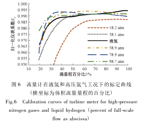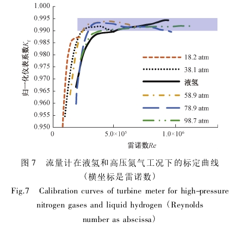 各個(gè)工況下的(de)标定曲線(xian)如圖6所示(shi),試驗結果(guo)用儀表系(xì)數K,表示,原(yuán)技術報告(gao)是以水标(biao)定的儀表(biǎo)系數作爲(wei)參照,經歸(guī)--化處理後(hou)作爲縱坐(zuo)标,橫坐标(biao)是體積流(liu)量量程的(de)百分比,爲(wèi)方便分析(xī),将标定數(shù)據轉爲圖(tú)7所示(橫坐(zuo)标以雷諾(nuo)數表示)。物(wù)性方面,58.9和(hé)78.9atm的高壓氮(dàn)氣分别與(yǔ)液氫的密(mi)度和運動(dòng)粘度很接(jiē)近,所以标(biāo)定結果對(duì)比符合流(liu)動相似準(zhun)則的要求(qiu)。6組标定數(shù)據在量程(chéng)的低區(<50%FS,Re<5x10')差(cha)異較大,标(biāo)定曲線呈(cheng)現出“扇形(xing)”特征,随着(zhe)雷諾數上(shang)升,差異逐(zhú)漸減小“扇(shan)形”趨于收(shou)斂。4個高壓(ya)氮氣(工況(kuàng)壓力≥38.1atm)以及(ji)液氫的标(biāo)定數據在(zài)量程的高(gao)區很接近(jìn),5條标定曲(qu)線聚合于(yú)一個0.5%的區(qū)間(如圖7中(zhōng)帶狀部分(fèn)所示)。如果(guǒ)以該區間(jian)作爲僅與(yǔ)雷諾數相(xiàng)關的聚合(he)域,4條高壓(ya)氮氣标定(ding)曲線随着(zhe)壓力的上(shang)升,依次進(jin)入該區間(jian),正如前文(wén)的分析,工(gong)況壓力越(yue)高,進入聚(jù)合域所對(dui)應的雷諾(nuo)數也越大(dà)。