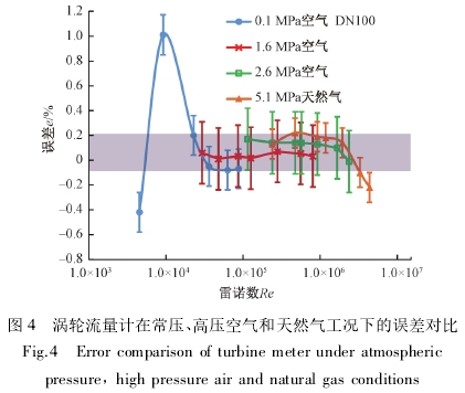 4個工況下(xià)的标定結(jie)果如圖4所(suo)示,誤差棒(bang)用各個裝(zhuāng)置的相對(duì)測量不确(que)定度表示(shi)。0.1MPa常壓空氣(qì)的上限雷(léi)諾數和2.6MPa高(gāo)壓空氣的(de)下限雷諾(nuò)數比較接(jie)近,各自對(duì)應的誤差(chà)相差0.24%。4個壓(yā)力工況(0.1.1.6、2.6和(he)5.1MPa)下的标定(ding)曲線包含(hán)3段明顯的(de)雷諾數重(zhòng)疊區域,區(qu)域内兩兩(liǎng)曲線之間(jiān)的差異小(xiǎo)于0.2%,而且2.6MPa空(kōng)氣與高壓(ya)天然氣(5.1MPa)的(de)标定曲線(xiàn)更爲接近(jìn),點對點差(cha)異甚至小(xiao)于0.1%。由于3個(ge)工況(常壓(yā)、高壓空氣(qì)和天然氣(qi))下的實驗(yan)相互獨立(lì),标定數據(jù)兩兩之間(jian)的差異小(xiao)于裝置間(jiān)的合成擴(kuò)展不确定(ding)度,說明渦(wō)輪流量計(jì)标定曲線(xian)随雷諾數(shu)變化,而且(qiě)随着工況(kuàng)壓力增加(jiā),标定曲線(xian)保持連續(xu)性延拓。當(dāng)Re>2.95x104,各個工況(kuàng)的标定數(shu)據之間的(de)差異不超(chao)過0.30%,如圖4帶(dài)狀區域所(suǒ)示,且随着(zhe)雷諾數增(zēng)加,這種差(chà)異呈現出(chu)逐漸縮小(xiao)的趨勢,曲(qu)線也逐漸(jiàn)相互接近(jìn)。基于渦輪(lún)流量計在(zai)高雷諾數(shu)區域表現(xiàn)出的這一(yī)特性,技術(shu)人員就能(neng)夠以較高(gāo)的置信度(dù)估計出流(liu)量計在其(qí)他相近工(gong)況壓力下(xià)的誤差。