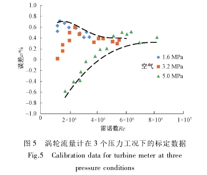 需(xu)要指出的(de)是,上述實(shi)驗是在流(liu)量計制造(zào)商限定的(de)體積流量(liang)量程内進(jìn)行,僅在部(bu)分雷諾數(shu)重疊區存(cun)在誤差的(de)點對點比(bi)較,爲了擴(kuo)大比較範(fan)圍,有必要(yào)将标定實(shi)驗拓展到(dào)流量計量(liàng)程的下限(xian)以下。爲此(ci),在高壓空(kōng)氣環道流(liu)量标準裝(zhuāng)置的3個工(gong)況(1.6.3.2.5.0MPa)下對一(yī)台DN150的渦輪(lún)流量計進(jìn)行多點标(biāo)定,結果如(rú)圖5所示。