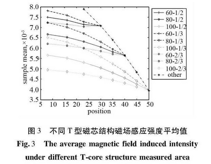 如圖3所(suǒ)示爲不(bú)同T型磁(ci)芯結構(gòu)下測量(liàng)區域産(chǎn)生磁場(chang)🔴感應強(qiang)度平均(jun1)值,圖中(zhōng)橫坐标(biao)爲T型磁(cí)芯b的角(jiao)度,縱坐(zuo)标爲測(cè)量✉️區域(yù)的平均(jun)磁場強(qiang)度,圖标(biao)表示的(de)是T型磁(cí)芯的不(bu)同α的角(jiǎo)度以及(ji)磁芯長(zhǎng)端寬度(du)所占的(de)比例其(qi)中以“角(jiǎo)度-比例(li)”表示,例(lì)如30-1/2表示(shi)T型磁芯(xīn)的較長(zhǎng)端角度(du)α爲30°,k1/(k1+k2)爲1/2時(shí)的測量(liang)區域中(zhong)平均磁(cí)場強度(dù)測量結(jié)果圖标(biāo)🤞Other爲T型磁(ci)芯較長(zhǎng)端的角(jiao)度α與較(jiao)💞短端✍️的(de)角度b相(xiang)等(即爲(wèi)🙇♀️23,30,35,40,45,50)時的流(liú)量計測(ce):量⁉️區域(yù)中的平(ping)均磁♋場(chang)強度.從(cong)仿真結(jie)‼️果可以(yǐ)看出:T型(xing)磁芯的(de)較長端(duan)的角度(dù)α越🔞小,流(liú)量計測(cè)量區域(yu)中平均(jun1)磁場強(qiáng)度越💞大(dà);在T型磁(ci)芯的較(jiào)長端的(de)角度α一(yī)定時,T型(xíng)磁芯的(de)較短端(duān)的角度(dù)b越小,流(liú)量計測(ce)量區域(yu)中平均(jun1)磁場強(qiáng)度越大(dà);在T型磁(cí)芯的較(jiào)長端的(de)角🔴度α與(yu)較短端(duān)的角度(du)b一定時(shi)🌈,T型磁芯(xīn)的k1/(k1+k2)越小(xiao),在流量(liang)計測量(liàng)區域中(zhōng)平均磁(cí)場強度(du)越大.