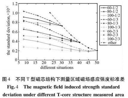 如(rú)圖4所示(shi)爲不同(tóng)T型磁芯(xin)結構下(xia)測量區(qū)域産生(sheng)磁💁場🛀感(gan)應強度(dù)标準差(chà),圖中橫(heng)坐标爲(wei)T型磁芯(xīn)b的角度(du),縱坐😄标(biāo)爲⭐測量(liàng)區域磁(cí)場強度(du)的标準(zhun)差,圖标(biao)圖例與(yǔ)圖3中一(yī)緻從仿(páng)真結果(guǒ)可以🔆看(kan)出:T型磁(ci)芯的較(jiao)長端的(de)角度α越(yuè)小,流量(liang)計測量(liang)區域中(zhong)磁場強(qiang)度标準(zhun)差越大(dà);在T型磁(ci)芯的較(jiào)長端的(de)角度α一(yi)定時,T型(xíng)磁芯🌈的(de)較短端(duan)的角度(du)b越小,流(liú)量計測(cè)量區域(yu)中磁場(chang)強度标(biāo)準差越(yuè)大;在💚T型(xing)磁芯的(de)較長端(duan)的角度(du)α與較短(duan)端的角(jiǎo)度b一定(dìng)時,T型磁(cí)芯的k1/(k1+k2)越(yue)小,在流(liu)量計測(cè)量區㊙️域(yu)中磁場(chang)強度标(biao)準差越(yue)大。
