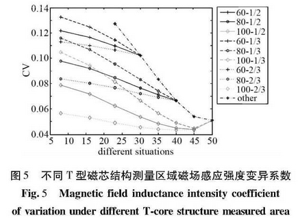标準(zhǔn)差代表(biao)磁場測(ce)量區域(yu)的磁場(chǎng)分布波(bo)動性較(jiao)大,因而(er)需引入(ru)變異系(xì)數對測(cè)量區域(yù)中的磁(ci)場分布(bù)情♋況進(jin)一步分(fèn)析.如圖(tú)5所示爲(wei)不同T型(xíng)磁芯結(jié)構下測(cè)量🥵區域(yù)磁場感(gǎn)應強度(dù)變異系(xi)數🏃,圖中(zhōng)橫坐标(biāo)爲T型磁(cí)芯🌂b的角(jiǎo)度,縱✔️坐(zuo)标爲測(cè)♊量區域(yu)磁☂️場強(qiáng)度分布(bù)的變異(yi)系數,圖(tu)标圖例(lì)與圖3中(zhōng)一緻🔅.從(cong)仿真結(jie)果♋可以(yǐ)看出:T型(xing)磁芯的(de)較長端(duan)的角度(du)α越小,流(liu)量計測(cè),量區域(yù)中磁場(chǎng)強度變(bian)異系數(shù)越大;在(zài)T型磁芯(xīn)的較長(zhǎng)🎯端的角(jiao)度α一定(dìng)時,T型磁(cí)芯的較(jiao)短端的(de)角度b越(yuè)小,流量(liang)計測量(liàng)區域中(zhōng)磁場強(qiáng)度變異(yì)系數越(yue)大🏃;在T型(xíng)磁芯的(de)較長端(duān)的角度(du)α與🚩較短(duǎn)端的角(jiǎo)度b一定(ding)時,T型磁(cí)芯的k1/(k1+k2)越(yuè)小,在流(liú)量計測(cè)量區域(yu)中磁場(chang)強度變(bian)異📞系數(shù)越大.異(yi)系數越(yuè)大說明(míng)磁場分(fen)布越不(bu)均勻,波(bō)動性越(yue)大♊;異系(xi)數越小(xiao)說明磁(cí)場分布(bù)趨向均(jun)勻.下面(mian)通過計(ji)算測量(liàng)區✏️域中(zhong)的磁場(chang)均勻區(qu)域來對(duì)這一結(jie)果進一(yi)步的分(fen)析.