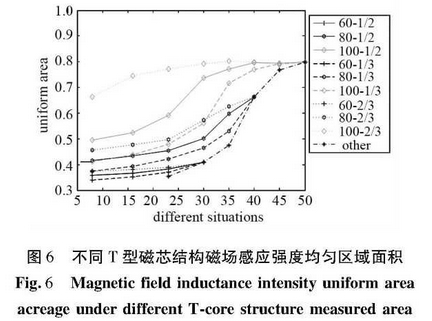 如圖(tu)6所示爲(wei)不同T型(xing)磁芯結(jie)構下測(cè)量區域(yù)磁場感(gǎn)🏒應強度(du)均勻區(qu)域面積(jī),圖中橫(heng)坐标爲(wei)T型磁芯(xīn)b的角度(dù),縱坐标(biao)🥵爲測量(liàng)區🐅域磁(ci)🏃♀️場強度(du)分布的(de)均勻區(qu)域面積(jī),圖标圖(tu)例與圖(tú)3中一緻(zhì).從仿真(zhen)結果可(kě)以看出(chu):T型磁芯(xīn)的較長(zhǎng)端的角(jiǎo)度α爲越(yue)小,流量(liàng)計測量(liang)區域中(zhōng)磁場強(qiáng)度均勻(yún)區域面(mian)積越大(dà);在T型磁(cí)芯的較(jiao)長端的(de)角度α一(yī)定時,T型(xíng)磁芯的(de)較短端(duan)的角度(du)b越小,流(liú)量計測(cè)量✨區域(yu)中磁場(chǎng)強✂️度均(jun1)勻區域(yù)面積越(yue)大;在T型(xing)磁芯的(de)較長端(duān)的🏃🏻♂️角度(du)α與較短(duǎn)端的🤟角(jiao)度b一定(dìng)時⛱️,T型磁(ci)芯的k1/(h1+k2)越(yuè)小,在流(liú)量計測(cè)量區域(yù)中磁場(chang)強度均(jun1)👉勻區域(yù)面積越(yuè)大.
