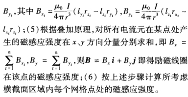 根據式(shi)(3)對電磁流量(liang)計勵磁線圈(quān)所産生感應(ying)磁場分🚩布✏️情(qíng)況進行數值(zhí)計算與仿真(zhen)。以2個勵磁線(xiàn)圈幾⛷️何中心(xīn)連線爲x軸,2個(gè)電極所在直(zhi)線爲y軸,測量(liang)管中🌂心軸線(xiàn)爲z軸,建立空(kong)間直角坐🤞标(biāo)系。在該坐标(biāo)系下,計算勵(lì)磁線圈在測(ce)☔量管道内電(dian)極橫截面上(shang)産生🐕的感應(yīng)磁場,其步驟(zhou)如下:(1)在x-y平面(mian)上測量管道(dào)的電🛀極橫截(jié)面内🙇🏻,對2個線(xiàn)圈之間區域(yu)進行網格化(huà),并确定每--網(wang)格點對應的(de)坐标值(x,y,0),網格(gé)劃分越細,區(qu)域内磁感應(yīng)強度計算精(jīng)度越高;(2)把載(zǎi)流導線劃分(fèn)成微電流元(yuan)的集合,并确(què)定每一微☁️電(diàn)流元矢量dl的(de)坐标(lx,ly,lz);(3)計算從(cóng)每個網格點(dian)到電💯流元的(de)徑矢r(rx,ry,rz)及其距(jù)離r;(4)在區域内(nei)每個網格點(dian)處,分别計算(suan)第t個電流元(yuán)産生的磁場(chǎng)強度矢量在(zai)x、y方向上的分(fen)量Bxt和