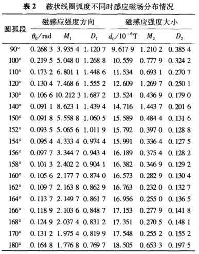 對于(yú)鞍狀線圈,把(bǎ)電極橫截面(mian)區域劃分成(chéng)41x41個網格,鞍狀(zhuang)線圈🌈的軸向(xiàng)長度爲6cm。每個(gè)勵磁線圈的(de)匝數爲6,厚度(dù)爲2cm,線圈緊貼(tie)測量管壁,線(xiàn)圈中電流強(qiáng)度爲10mA。首先令(lìng)線圈圓弧段(duan)的弧度範圍(wei)爲90°~180°,間隔10°;其次(ci),在前面确定(dìng)弧度160°附近,提(tí)高尺度分辨(biàn)率,從150°到170°,間🆚隔(ge)2°。鞍狀線🈲圈在(zai)電極橫🙇🏻截面(mian)上的感應磁(cí)場分布情況(kuang),如表2所示。