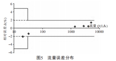 經過上(shang)述測量(liang)方法與(yǔ)數據處(chu)理後的(de)DN20管徑試(shì)驗樣機(jī)✔️測量結(jie)果如表(biǎo)1所示。從(cong)表中可(kě)以看出(chu),在常用(yòng)流量Q3(4000L/h)内(nèi)🈲,流量傳(chuan)感器具(ju)🍓有很好(hao)的流量(liàng)特性,在(zai)R200範圍内(nèi)♈相對誤(wu)差≤2%,在R160範(fàn)☁️圍内相(xiang)對誤差(cha)≤1%。其流量(liàng)誤差分(fèn)布如圖(tú)5所示,在(zài)全流量(liàng)範圍内(nèi),測量誤(wu)差全部(bù)在MPE(最大(da)允許誤(wù)差)内。