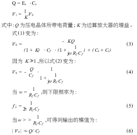 式中:Rƒ爲反(fan)饋電阻;Cƒ爲反(fan)饋電容;V0爲輸(shu)出電壓;Vt爲輸(shu)入電壓;Es爲壓(ya)電👣晶體産生(shēng)的等效電壓(ya);Cs爲信号源等(deng)效電容;Ce爲電(diàn)纜之間的分(fèn)布❓電容。