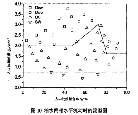 爲(wèi)了考察渦(wō)輪流量計(jì)計量精度(du)與流型之(zhi)間的關系(xi),繪🍉制了粘(zhan)🔞度爲50mPa·s時的(de)流型圖,并(bing)且與以前(qian)的學者🍓得(de)到的流型(xíng)圖進行🏃🏻了(le)比較。實驗(yan)中流型是(shì)觀察實驗(yan)管段🧡得到(dao)的,同時采(cai)用Lafin和Oglesby提出(chu)的方法來(lai)定義流型(xíng)5)。在一定的(de)混合流速(su)和輸入油(you)相含率下(xià),在水平實(shí)驗管段觀(guan)察到了四(si)種🤞流型,即(ji):分層流(SW),雙(shuāng)連續流(DC),油(you)含水(W/O)以及(ji)水💚含油(O/W)。圖(tu)10給出了實(shi)驗中得到(dào)的流型圖(tú),其中固定(ding)線爲Lovick和Angeli在(zai)2001年得到的(de)流型圖.