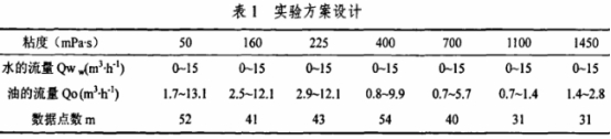 實驗水相(xiàng)爲普通自(zi)來水,20℃時的(de)粘度爲1.005mPas,油(yóu)相采用無(wú)色、透明📧的(de)礦物油,俗(sú)稱白油,在(zài)常溫常壓(ya)(20C,0.101mPa)下,我們分(fèn)别選用其(qí)🚶♀️粘度🈲爲50、160、225、400、700、1100和(hé)1450mPars,共七🛀🏻種樣(yàng)品。同時,爲(wei)便于實驗(yàn)時的流🏃🏻型(xíng)觀察,在水(shuǐ)中加入了(le)高錳酸鉀(jia)(顔色劑)以(yǐ)便于識别(bié)。實驗工質(zhì)⚽溫度控制(zhi)在19℃~21℃,在特定(ding)的粘度下(xia),給定油相(xiàng)流量後,調(diao)整水相流(liu)量,觀察實(shí)驗段的油(you)😍水兩相流(liú)型,記錄入(rù)口處不同(tong)流型的油(yóu)相和水相(xiàng)表觀流速(su)和實驗段(duàn)的混合流(liu)速。表1給出(chū)了不同粘(zhān)度下的實(shí)驗數組。