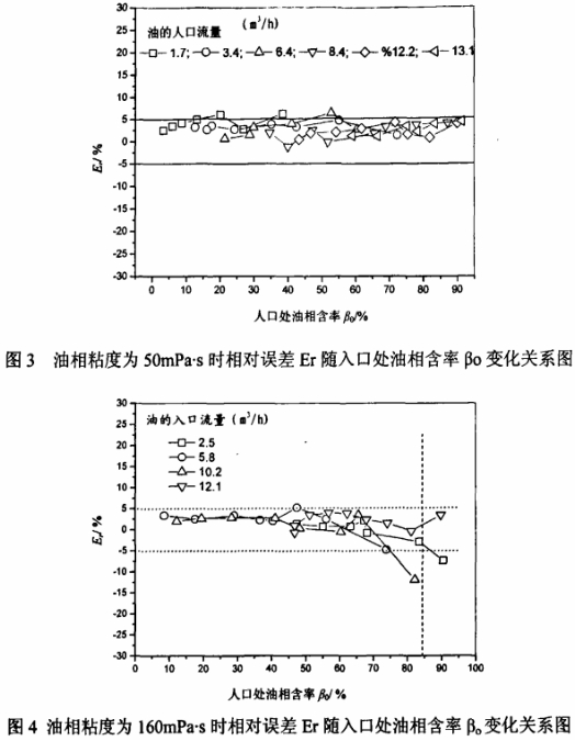 圖3至圖9給(gei)出了在七(qi)種不同粘(zhan)度下,渦輪(lún)流量計的(de)測量誤差(chà)随入口處(chu)油相含率(lǜ)的變化關(guān)系圖。以實(shi)際應🏃🏻♂️用中(zhong)🤩可以接受(shou)的誤🌏差+5%作(zuo)爲其有效(xiao)工作區間(jian)的判斷标(biao)準(在圖中(zhong),+5%的🥰區間用(yong)💞虛線标出(chu)),并且在每(mei)個圖标上(shàng),用一條豎(shu)直的虛線(xiàn),作爲有效(xiào)工作區域(yu)的分界線(xian)。圖3給出了(le)油相💃🏻粘度(dù)爲50mPa's時相對(duì)誤差随入(ru)口處油相(xiang)含率變化(huà)關系圖。可(ke)✉️以看出,在(zài)整個🤟油相(xiàng)含率的變(bian)化範圍内(nei),誤差可以(yi)控制在+5%以(yǐ)内,隻有個(gè)别的點超(chāo)過了5%的範(fàn)🔱圍,因此可(ke)以認爲在(zai)油相粘度(du)爲50mPars時,渦輪(lun)流量計在(zai)任何油相(xiàng)含率下均(jun)處于有效(xiào)工作區間(jiān)。對于油相(xiàng)粘度爲160mPa's的(de)實驗研究(jiu)結果顯示(shi)(如圖4所示(shi)),随着油相(xiang)含率βo的增(zeng)加,相對誤(wù)差有逐漸(jiàn)❤️增大⭐的趨(qu)勢,同時,絕(jue)對誤差值(zhi)也由βo較小(xiǎo),時的正值(zhí),變爲βo較大(dà)時的負值(zhí)。但是大部(bù)分的入口(kǒu)油相含率(lǜ)βo的變化範(fàn)圍内,相對(duì)誤差在+5%以(yi)内,這與黏(nián)度爲50mPars時的(de)情況大體(ti)--緻.