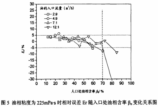 當油相(xiàng)粘度提高(gao)至225mPa·s時(圖5所(suǒ)示),觀察到(dao)了與圖4相(xiàng)似🌐的曲🏒線(xiàn)變化趨勢(shi),不同的是(shì):當β。的小于(yú)70%時,相對誤(wù)差在5%以内(nèi),渦輪流量(liàng)計處于🔴有(you)效工作區(qu)間。然而,随(sui)着β。的增加(jiā),誤差曲線(xian)下降的幅(fú)度增大,當(dang)🐅βo達到70%時,整(zhěng)體📱誤差超(chao)過了5%的界(jiè)線💚,達到10%以(yǐ)上,此時,渦(wo)輪流量計(jì)超出了其(qí)有效工作(zuò)區間,失效(xiao)區開始出(chū)現。