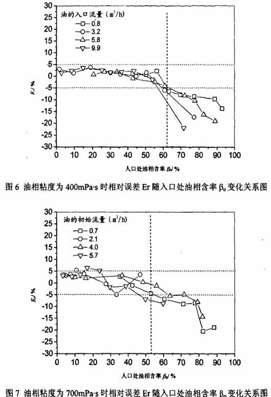圖6和圖(tu)7分别給出(chū)了油相粘(zhan)度爲400mPa·s和700mPa·s時(shi)相對誤差(chà)随入🔅口處(chu)油👅相含率(lǜ)的變化關(guān)系圖。可以(yǐ)看出,當βo達(dá)到50%~60%時,誤差(chà)出😄現比較(jiào)陡峭的下(xia)降,其整體(tǐ)誤差超過(guò)5%的界線,渦(wo)輪流量計(ji)超出🈲了有(yǒu)效工作區(qū),而且,随着(zhe)βo的增加,絕(jué)對誤差也(ye)由正值變(biàn)成負值。