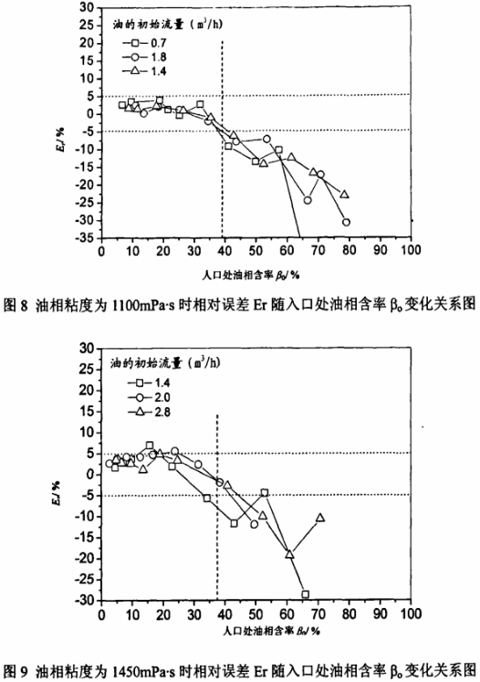 爲(wèi)了進一步(bù)研究超粘(zhan)油對于渦(wo)輪流量計(jì)測量精度(du)的影響,我(wo)們分别測(ce)量了油相(xiang)粘度爲1100和(hé)1450mPars時渦輪流(liú)量計測量(liang)油水兩相(xiàng)流量時的(de)工作特性(xìng)。圖8和圖9給(gei)出了實驗(yàn)結果,可以(yǐ)看出,當βo僅(jin)爲30%~40%左右時(shi),誤差便開(kai)始急劇下(xià)降。因此,對(dui)于超粘油(you)來說,渦🧡輪(lún)流量計的(de)僅能在低(dī)含油率的(de)情況下工(gōng)作,有效工(gōng)作區的⛱️範(fàn)圍非常狹(xiá)窄💯。