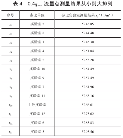 綜上,考(kao)慮比對(dui)工作的(de)嚴謹性(xìng),在此次(ci)異常值(zhí)判别時(shi),選用格(gé)拉布斯(sī)準則和(hé)狄克遜(xun)準則綜(zōng)合進行(hang)。通過異(yi)常值判(pàn)别結果(guǒ)分析可(ke)知:在0.4qmax流(liú)量點,實(shi)驗室3的(de)測量結(jié)果經過(guo)兩種判(pàn)别準則(ze)判斷均(jun)不屬于(yú)異常值(zhí),可正常(cháng)參與計(jì)算;在0.7max.流(liu)量點,實(shi)驗室3的(de)測量結(jie)果用格(gé)拉布斯(si)準則判(pàn)别屬于(yu)異常值(zhí),用狄克(ke)遜準則(zé)判别不(bu)屬于異(yi)常值,兩(liang)種判别(bie)方法結(jié)論出現(xiàn)矛盾。比(bǐ)對工作(zuo)對統計(jì)數值要(yao)求較高(gāo),出現既(ji)可能是(shi)異常值(zhí)又可能(néng)不是異(yi)常值的(de)情況時(shi),考慮将(jiang)此次測(cè)量結果(guo)作爲異(yi)常值考(kao)慮。最終(zhong)将0.7qmax流量(liang)點實驗(yàn)室3的測(cè)量結果(guǒ)作爲異(yi)常值,予(yǔ)以剔除(chú)。