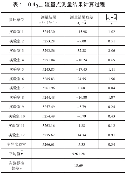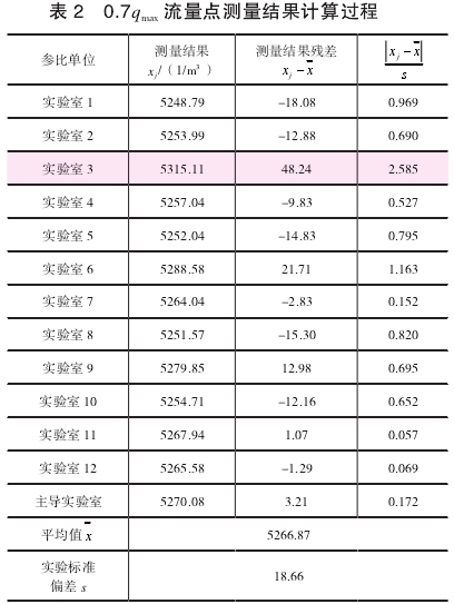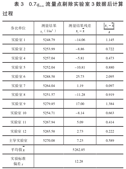 可以判(pàn)定實驗(yan)室3在0.7qmax流(liu)量點的(de)測量結(jié)果屬于(yu)異常值(zhi),需要剔(tī)除。剔除(chu)後,12組數(shù)據重複(fú)上述過(guo)程,計算(suàn)結果如(ru)表3所示(shi),置信水(shui)平P=95%,即α=1-0.95=0.05,n=12,查(cha)格拉布(bu)斯準則(zé)的臨界(jiè)值表得(de)到G(0.05,12)=2.285,可以(yǐ)判斷無(wú)異常值(zhi)。
