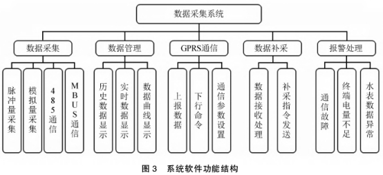 根據大口徑(jing)流量計數據(ju)采集系統的(de)軟件功能分(fèn)😄析和現場需(xu)✔️求,設計的系(xì)統功能詳細(xì)展示如圖3,主(zhǔ)要實❄️現數據(ju)采集功能、數(shu)據管理功能(néng)、GPRS通信功能、數(shu)據補采功能(néng)以及報警☀️功(gōng)能等數據采(cǎi)集功能:脈沖(chong)🚶量采集功能(neng),主要用🔴于單(dan)脈沖、雙脈沖(chòng)、三脈沖基表(biao)累計流量采(cai)集,其中雙脈(mo)沖、三脈沖基(ji)🤟表具有水流(liu)方向判斷和(hé)正、負流量計(jì)量功能;模拟(ni)量采集🔞功能(néng),主要,用于⁉️采(cǎi)集瞬🔴時流量(liang);DC0-10V以及标準RS-485通(tōng)信接口,可以(yǐ)與基表進行(háng)RS-485通信,可🌈作爲(wèi)MBUS主站與MBUS從站(zhan)基表進行通(tong)信。