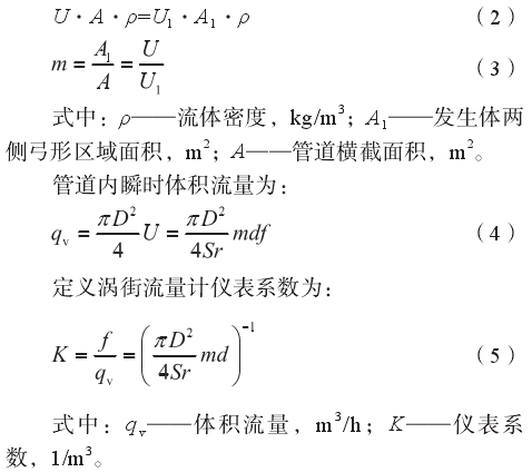 式(shì)中:ƒ一旋(xuan)渦分離(li)頻率,Hz;Sr-斯(si)特勞哈(ha)爾數;U1一(yī)發生體(ti)兩側流(liú)體平均(jun)流速,m/s;U一(yi)管道來(lai)流平均(jun)流速,m/s;m一(yi)發生體(tǐ)兩側弓(gong)形流通(tong)⚽面積與(yu)管道橫(héng)截面積(ji)之比。