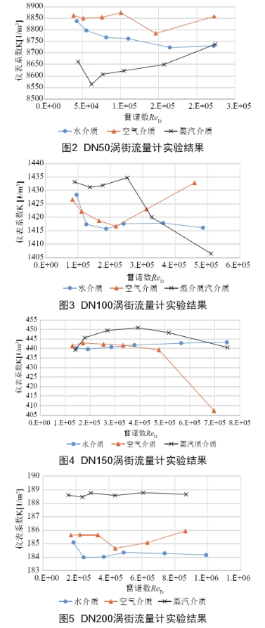 按(an)照2.3中的(de)實驗方(fang)案對四(si)台不同(tong)口徑的(de)渦街流(liu).量計在(zai)水、空氣(qi)🌈、蒸汽三(sān)種介質(zhì)下進行(háng)儀表系(xi)數實流(liu)标定實(shí)驗🚶,實驗(yan)結果🌈如(rú)圖🧡2~5所示(shì)。