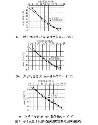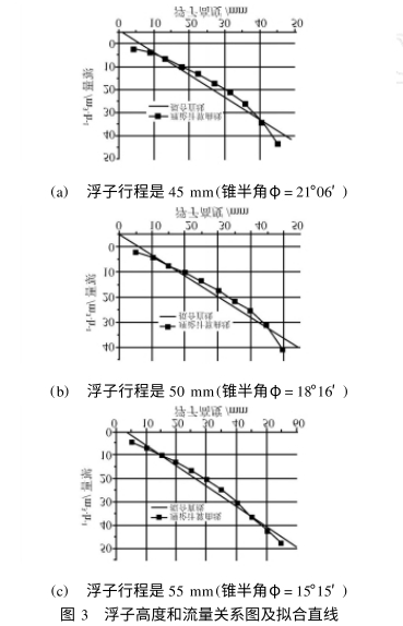 如圖3所示,(a)、(b),(c)分别(bié)是行程爲45mm,50mm和55mm的(de)浮子流量計浮(fu)子高🌈度㊙️和🔞流🌈量(liàng)間對應關系曲(qu)線及利用最小(xiǎo)二乘法拟合的(de)直線.從表1.表2,表(biǎo)3中第三列所示(shi)的非線性誤差(cha)🏒數據可以看出(chu),當利用公式(1)進(jìn)行流量計算時(shí)在不同的流量(liang)點處流量和浮(fu)子高💃🏻度之間表(biǎo)現出了不同的(de)非線性💰誤差,流(liu)量和浮子高度(du)之間不是線性(xing)對應關系.