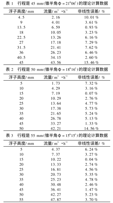 爲(wei)了研究浮子流(liu)量計的非線性(xing)問題,本文利用(yong)公式(1)針對浮子(zǐ)在錐管中的垂(chui)直位置和流量(liang)的對應關系給(gěi)出了三組理論(lun)計❌算數據.