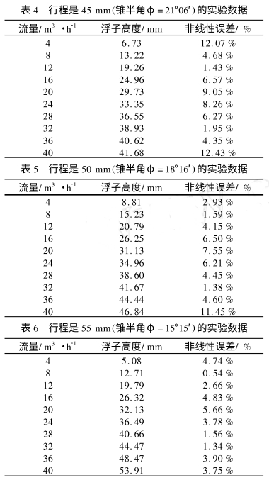 當浮(fú)子行程是45mm(錐半(ban)角φ=21°06')時:最大非線(xian)性誤差γmax=12.43%,平均非(fei)線性誤差γ=6.71%.