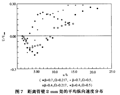 摘(zhai)要:本文介紹(shao)旋渦流對孔(kong)闆流量計 性(xing)能影響的結(jié)果。主要對β值(zhí)和旋渦強度(du)進行了分析(xī)。該項工作生(sheng)要基于流動(dòng)圖形測試法(fa)、IDA激光多普勒(lè)測速和管壁(bi)壓力測量法(fǎ),借助一個流(liu)體動力學裝(zhuāng)置完成的。另(ling)外,還對管内(nei)流動與△p差壓(yā)測量之間的(de)關系進行了(le)FENXI 。 概述 該工作(zuò)的主要目的(de),一方面是更(gèng)好地了解孔(kǒng)闆兩側的穩(wěn)定流和不穩(wen)定流現象,另(ling)一方面是确(què)定上遊流動(dòng)幹擾對内部(bù)流動特性和(he)對流量測量(liàng)的實際影響(xiang)。爲了達到上(shang)述目的,采用(yòng)了多種試驗(yàn)和數值計算(suàn)方法。 在試驗(yan)中,采用了流(liú)動圖像法,激(jī)光多普勒測(cè)速儀(L.D.V)測量二(èr)維速度和管(guǎn)壁差壓測量(liàng)法。 試驗時,選(xuan)取了2個β值(0.4和(he)0.7)。雷諾數(Uv·D/v)在104~2×105之(zhi)間。 二、試驗設(she)備 1.試驗裝置(zhì) 圖1爲試驗裝(zhuang)置,主要由水(shui)平試驗管路(lu)及一台離心(xīn)泵組成。該離(lí)心泵通常在(zai)過壓狀态下(xià)運行。試驗時(shí),由離心泵将(jiāng)水箱A(容積爲(wei)1m³)中的水抽出(chu),其最大排量(liàng)爲140m³/h,輸出相對(dui)壓力爲20m水柱(zhù)。由泵輸送的(de)水,一部分通(tong)過主試驗管(guǎn)路的試驗段(duan),另-部分經旁(páng)通管路返回(hui)到原來的水(shui)箱中。主試驗(yàn)管路是一段(duan)口徑爲125mm的直(zhi)管段,一台标(biāo)準電磁流量(liang)計安裝在該(gāi)直管段上,其(qí)準确度爲1%。該(gāi)直管段的末(mo)端與密閉水(shuǐ)箱B相連,這樣(yàng)可以消除由(you)離心泵引起(qi)的任何脈動(dòng)流影響。在水(shuǐ)箱B的出口裝(zhuāng)有口徑爲100mm的(de)直管段,其中(zhōng)測試段就安(ān)裝在此直菅(jiān)段上。試驗中(zhōng),水返回到水(shuǐ)箱A或者被排(pai)出。另外,試驗(yan)時還可向水(shui)中注人染料(liào)。利用2個并聯(lian)安裝在試驗(yàn)段下遊的控(kong)制閥來調節(jiē)通過試驗段(duan)的水流量。爲(wèi)了避免試驗(yan)過程中水介(jie)質的溫度上(shang)升,設置了一(yī)台循環水式(shì)換熱器。在環(huán)路中冷卻水(shuǐ)的流量采用(yòng)伺服控制,其(qí)溫度偏差在(zai)±0.5C範圍内。試驗(yan)段上遊口徑(jing)100mm直管段的長(zhǎng)度爲4m,在其人(rén)口安裝了一(yī)台管束式整(zhěng)流器。試驗段(duàn)由孔闆兩側(ce)分開,分爲上(shàng)遊和下遊試(shì)驗段。試驗管(guǎn)段采用有機(jī)玻璃透明管(guan)段,以便觀測(ce)流型和激光(guāng)多普勒測速(sù)。由于在空氣(qì)和有機玻璃(lí)管段之間存(cun)在讀數偏差(chà),爲了避免有(you)機玻璃管段(duàn)産生的折射(shè),而将有機玻(bo)璃管段的外(wài)壁做成平面(mian)。爲了更好地(di)觀察孔闆兩(liang)邊的流動狀(zhuang)态,孔闆兩側(cè)的法蘭是經(jīng)過特殊的,盡(jìn)量保證爲0.15D。孔(kǒng)闆上、下遊的(de)直管段長度(dù)爲0.5m。這樣就可(kě)完成孔闆兩(liang)側回流區的(de)試驗:甚至β值(zhi)爲0.4也可以。 2.旋(xuán)渦流發生器(qi) 旋渦流是由(you)一種切向流(liú)發生器産生(sheng)的,如圖2所示(shì)。部分流體從(cong)其人口沿着(zhe)與軸線成切(qie)線方向進人(ren),從而産生旋(xuán)轉流。旋渦強(qiáng)度的确定借(jiè)助于軸向流(liú)量Q軸向和總(zǒng)流量Q總流量(liang)之間的關系(xi)來定。即用無(wú)量綱旋流系(xì)數Q表達,其變(biàn)化範圍爲0(無(wú)旋流)至1(最大(da)旋流),數字表(biǎo)達式爲: 據有(you)關文獻介紹(shao),旋渦強度也(ye)可用旋渦數(shu)量s來表示,即(ji)通過平均軸(zhou)向分布U(r)和平(ping)均切向分布(bù)W(r)計算出來,表(biǎo)達式爲: 該旋(xuan)流系數n可以(yǐ)通過試驗與(yu)經典的旋流(liu)數S用線性關(guān)系聯系起來(lái)。 三、試驗結果(guo) 在試驗過程(chéng)中,β值爲0.7和0.4,雷(léi)諾數爲100000。 1.流動(dong)狀态觀測 在(zai)與管道同直(zhí)徑的孔闆的(de)邊緣處設置(zhì)2個毛細管,并(bing)且與管道的(de)軸線對稱。試(shì)驗時,向兩根(gēn)毛細管中注(zhù)人示蹤劑(氣(qi)體或液體),觀(guan)測孔闆下遊(yóu)的流動狀态(tài)。爲了清晰地(di)觀察流動狀(zhuang)态,在透明管(guǎn)段上遊放置(zhì)一照明設備(bèi),其光束可以(yǐ)與軸線平行(hang)或垂直。 觀察(chá)結果表明,旋(xuán)渦流使得射(shè)流擴大而回(huí)流區減小。而(ér)且,當旋流系(xì)數n較大和β值(zhi)較小時,孔闆(pǎn)下遊處有明(míng)顯的射流沖(chòng)擊,使得作用(yòng)在管壁上的(de)壓力産生很(hěn)大的波動。. 2.速(su)度測量 試驗(yan)中,使用了一(yi)台二維激光(guāng)多普勒測速(sù)儀。在旋流強(qiang)度Ω爲0.2和0.5時,進(jin)行了測試。 3.上(shang)遊流動狀态(tài) 圖3示出了在(zài)孔闆上遊1D處(chu)測得的平均(jun)軸向速度U和(hé)切向速度W的(de)分布情況。 從(cong)中可以看出(chu),随着旋渦強(qiáng)度的增加,軸(zhóu)向速度U分布(bù)趨于變平。 從(cong)切向速度分(fen)布圖中可以(yǐ)看出,旋轉以(yǐ)管道軸線 爲(wei)中心并分爲(wèi)兩個區域。在(zài)管道的中心(xīn)(0≤r/D<0.25)爲“強旋渦型(xíng)”區,在該區内(nèi)切向速度W與(yǔ) 半徑r成正比(bi)。接近于管壁(bì)時,出現了一(yi)個由于摩擦(cā) 使得旋轉速(su)度降低的區(qū)域。 利用上述(shu)的速度分布(bù)圖,可以計算(suan)出旋渦數s和(hé)旋渦角θs。因此(ci),當