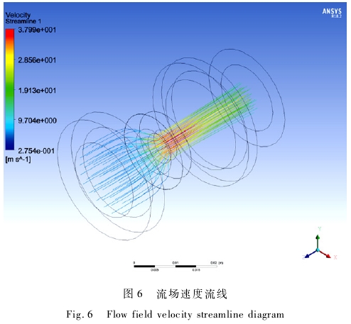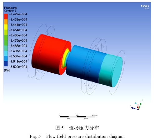 圖5中,顔色(sè)深淺代表壓力(li)的大小分布情(qíng)況,單位.爲Pa。從圖(tu)中可以得出,氣(qi)體流入流量計(ji)孔闆上端管道(dao)部分,由于氣泵(bèng)抽氣産生負壓(ya),壓力值大概在(zài)-3.422X104--3.443x104Pa,氣體流入錐形(xing)孔闆瞬間,壓力(li)急速減小,壓力(lì)減小範圍在-3.443x104--3.518x104Pa,經(jīng)過孔闆後壓力(lì)維持在-3.507x104~-3.497x104Pa。氣體從(cóng)錐形孔闆經過(guo)時壓力減小,流(liu)經流量計下端(duan)部時流量增大(dà),從而産生了孔(kǒng)闆前後的壓差(cha),環境空氣經過(guo)差壓式孔闆時(shí),由于孔闆的阻(zǔ)隔瞬間形成高(gāo)壓狀态,孔闆的(de)錐角處圓角處(chu)理,空氣流過孔(kǒng)闆椎孔處壓力(li)有一-定程度的(de)增大。流體仿真(zhen)得到的流量計(jì)個管道速度分(fèn)布情況如圖6所(suǒ)示,單位爲m/s。如圖(tú)所示,氣體流入(rù)流量計孔闆上(shang)端瞬間,産生了(le)一個回轉對稱(chēng)性的速度場,中(zhong)心軸線處速度(du)最大,氣體在差(chà)壓式流量計管(guan)壁處碰撞後産(chan)生回旋,速度降(jiang)低并産生壓降(jiang),在錐形孔處由(yóu)于錐角做圓角(jiao)處理後,平緩過(guò)渡,氣體速度有(yǒu)不同程度的增(zēng)大。氣體流入孔(kong)闆前速度範圍(wéi)大概在0.2754~1.913m/s,流人孔(kong)闆瞬間,速度增(zeng)大,管道軸心處(chu)速度最高可達(da)3.799m/s,經過孔闆後速(sù)度範圍大概在(zai)1.913~3m/s,并向管壁處速(sù)度遞減從而在(zài)管壁處形成回(huí)旋産生低壓。氣(qì)體未經過錐形(xíng)孔闆前速度變(bian)化明顯較小,經(jing)過孔闆後速度(dù)明顯增大,在管(guǎn)道軸心處速度(du)數值最大。