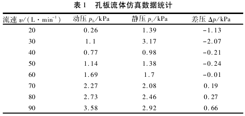 孔闆(pǎn)壓力損失是孔(kǒng)闆.上端測得壓(yā)力與孔闆下端(duan)測得壓力數值(zhi)之差,差壓數據(jù)穩定性是控制(zhi)泵的關鍵條件(jiàn)[7-8]。參考100L/min的仿真條(tiáo)件,将入口速度(du)調整至10~90L/min,每10L/min作爲(wei)一次步長,流體(ti)仿真後得到流(liú)速、動壓、靜壓和(hé)差壓的數據,如(rú)表1所示。