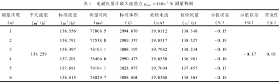 本次試驗選(xuan)取的被檢流(liú)量計爲0.2級DN100的(de)電磁流量計(ji),以最大流量(liang)點qmx=140m3/h爲例,其測(ce)量數據如表(biao)1所示。根據貝(bèi)塞爾😍公式🥰計(jì)算重複性可(ke)得Er=0.01%。由于在重(zhong)複性條件下(xia)實際測量了(le)6次,以6次的📧測(cè)量算㊙️術平均(jun)🏒值爲測得值(zhí),則顯示流量(liang)Q測量重🆚複性(xìng)引入🈲的相對(duì)标準不确定(dìng)度爲:
