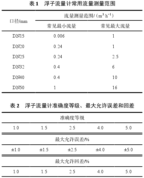 浮子流(liu)量計被(bèi)廣泛應(ying)用于小(xiao)管徑、低(dī)流速測(cè)流領域(yu)。以液體(ti)爲☁️例,口(kou)徑10mm以下(xia)玻璃管(guǎn)浮子流(liú)量計滿(mǎn)度流量(liàng)的名義(yì)管徑,流(liú)速隻在(zai)0.2~0.6m/s之間,甚(shen)至低于(yu)0.1m/s8。常用浮(fú)㊙️子流量(liàng)✂️計口徑(jìng)爲DN15~DN50,對應(yīng)🥰的流量(liàng)範圍和(hé)精度等(děng)級分别(bié)見表1和(he)表2。