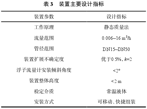 根據(ju)常用流(liu)量計口(kǒu)徑、精度(du)等級和(hé)流量測(ce)量範圍(wéi)進行裝(zhuang)置設計(jì),具體設(shè)計指标(biāo)見表3。裝(zhuāng)置設計(ji)采用測(ce)量精度(du)較高的(de)靜态質(zhì)量法,流(liú)量範圍(wei)0.006~16m2/h,滿足常(chang)用口徑(jing)DN15~DN50液體浮(fu)子流量(liàng)計檢定(ding)需🐆求。浮(fú)子流量(liang)計檢定(dìng)裝置的(de)擴展不(bú)确定度(dù)應優于(yú)被檢流(liu)量計最(zuì)大允⛱️許(xǔ)誤差的(de)1/2凹⛷️最高(gāo)精度等(deng)級浮子(zi)流量👨❤️👨計(jì)爲1.0級(表(biao)2),因🐅此組(zu)合裝置(zhì)的擴展(zhan)不确定(ding)度💘應優(you)于0.5%。爲保(bao)證測量(liang)正确率(lü),浮子流(liu)量🔅計安(an)裝傾斜(xié)角度應(ying)<2°。爲了方(fāng)便裝置(zhì)的移動(dòng)、拆卸和(hé)高效組(zu)裝,整套(tào)裝置高(gao)度應不(bú)超過2m。
