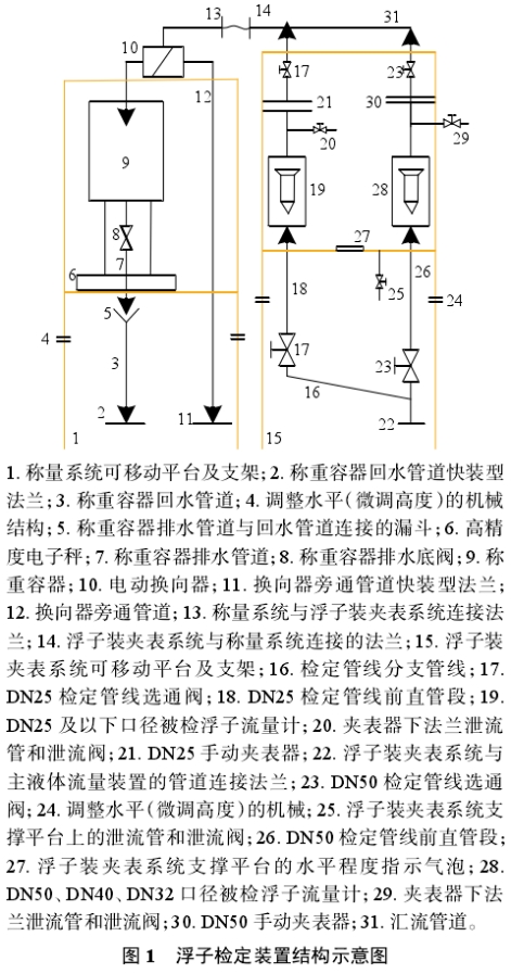 浮(fu)子流量(liàng)計檢定(dìng)裝置結(jié)構設計(jì)如圖1,其(qi)主體爲(wei)2個長方(fāng)體❗框架(jia),由浮子(zǐ)流量計(jì)裝夾表(biao)系統和(hé)稱量系(xi)‼️統(含水(shui)流🈚換向(xiàng)系統)組(zǔ)成。浮子(zi)流量計(ji)裝夾表(biao)系統中(zhong)部爲工(gong)作台面(miàn),台面🥵一(yi)側安裝(zhuang)有水平(ping)尺,框架(jia)底部安(an)裝有🐇4個(ge)腳輪和(he)4條可伸(shen)縮支腳(jiǎo)便于🐪裝(zhuāng)置的移(yí)動和調(diao)節固定(dìng)。進水管(guǎn)路上依(yī)次安裝(zhuang)有快速(sù)接頭、開(kai)關閥、調(diào)節閥和(hé)排水閥(fa)。裝置上(shàng)端設置(zhì)手動夾(jia)表器,實(shí)現被檢(jian)浮子流(liu)量計的(de)安裝與(yu)🏃🏻拆卸。稱(chēng)重系統(tong)包括換(huan)向器、稱(chēng)量容器(qi)和電子(zǐ)秤。稱重(zhòng)系統下(xia)部爲🔅工(gong)作台面(miàn),同樣安(an)裝水平(ping)尺、腳輪(lun)和可伸(shen)縮支腳(jiao),實😄現被(bei)檢浮子(zǐ)流量計(jì)與稱重(zhòng)系統的(de)連通。