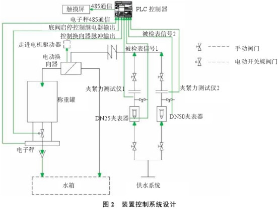 裝置控(kong)制部分(fèn)主要包(bāo)括夾緊(jin)力控制(zhi)系統、換(huan)向器控(kòng)制系統(tǒng)和稱重(zhòng)控制系(xì)統(圖2),獲(huo)取電子(zi)稱讀數(shù)、控制夾(jia)表器、控(kong)制💁換向(xiàng)器動作(zuò)、控制底(di)閥開關(guān)、脈沖計(ji)數等由(yóu)計算機(ji)完成。在(zài)夾緊力(lì)控制系(xi)統的設(she)計,上,考(kǎo)慮到被(bei)檢浮子(zǐ)流量計(jì)容易損(sun)壞,在每(mei)個夾表(biao)器.上安(ān)裝夾緊(jin)力傳感(gǎn)器(夾緊(jin)力測試(shi)儀☁️1和夾(jiá)緊力測(ce)試儀2)。當(dāng)夾緊🏃♀️力(li)過大時(shi),由計算(suàn)機進行(hang)夾緊力(lì)超限報(bào)警,提示(shi)操作人(rén)員停止(zhi)夾緊動(dong)作;換向(xiàng)器控制(zhi)系統♍中(zhōng),換向器(qi)是液體(tǐ)流量裝(zhuāng)置的重(zhòng)要組成(chéng)部分,其(qí)不确定(ding)度🥰大小(xiao)對裝置(zhì)👄整體合(he)成不确(què)定度有(you)較大影(ying)響1011)影響(xiang)換向器(qi)精度的(de)主要因(yīn)素是實(shi)際注水(shuǐ)時間和(he)觸發光(guang)電信号(hao)所産生(sheng)㊙️時間之(zhi)間的誤(wu)差凹本(ben)裝置采(cai)用步進(jin)電機驅(qū)動㊙️分水(shui)器換向(xiàng),由PLC發送(sòng)脈沖控(kong)制電機(jī)🐉轉速、加(jiā)速度和(hé)轉動角(jiǎo)👈度。通過(guò)PLC的高速(sù)脈沖輸(shu)出通道(dao),向換向(xiang)器的步(bù)進電機(ji)驅動器(qi)按照勻(yun)加速-定(ding)速勻減(jian)速的🆚方(fang)式發送(sòng)脈沖,換(huàn)向器電(dian)機帶着(zhe)換向器(qi)導流體(tǐ)進行加(jia)速-勻速(sù)-減速的(de)🚶運行。控(kòng)制換向(xiang)器運動(dong),保證裝(zhuāng)置不确(què)定度水(shuǐ)平;稱重(zhong)控制系(xì)統中,裝(zhuang)置主标(biāo)準器精(jīng)度高電(dian)子秤通(tōng)過485通信(xìn)模式🈲,将(jiang)傳感器(qì)☂️讀數傳(chuán)輸至PLC控(kòng)制器,實(shí)現實時(shi)數據采(cai)集。