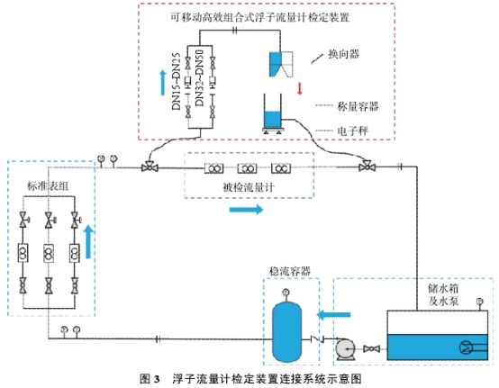 浮子流(liu)量計檢(jiǎn)定裝置(zhi)和液體(tǐ)流量裝(zhuang)置連接(jie)後的系(xì)統示意(yì)圖如圖(tu)3,組合裝(zhuang)置由儲(chǔ)水系統(tong)、水源循(xun)環穩壓(ya)系統、變(bian)頻㊙️調速(sù)系統、裝(zhuāng)夾表系(xì)統、水流(liú)換向系(xi)統、計算(suan)機控制(zhi)系統、标(biāo)🈚準器和(he)🏃🏻儀表檢(jian)定管線(xian)系統組(zu)成。在水(shuǐ)流量裝(zhuāng)置管段(duan)前後安(ān)裝三通(tōng)閥和預(yu)留旁路(lù),通過控(kong)制三通(tōng)閥實現(xian)水流在(zài)試驗管(guan)路和旁(pang)㊙️路之間(jiān)的切換(huàn),三通閥(fa)的一端(duan)🔴分别通(tōng)過軟管(guǎn)🐪與可移(yí)動浮子(zǐ)⁉️流量計(ji)檢定裝(zhuang)💛置的人(ren)、出口相(xiang)連,形成(cheng)浮子流(liu)量計檢(jian)定回路(lu)。浮子流(liú)量計檢(jiǎn)定裝置(zhi)和液體(tǐ)流量裝(zhuang)置連接(jie)成高效(xiào)🔅組合裝(zhuāng)置,将水(shui)平流場(chǎng)轉換📱成(cheng)适合浮(fu)子流量(liàng)計檢定(dìng)的垂直(zhí)流場。