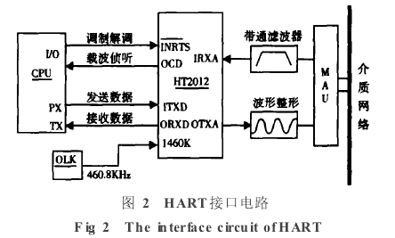 HT2012芯片用(yòng)來實現(xian)HART協議中(zhōng)通訊信(xìn)号的解(jie)調及調(diao)制過程(cheng).圖2爲調(diào)制解調(diào)器與微(wēi)處理器(qi)的連接(jiē).