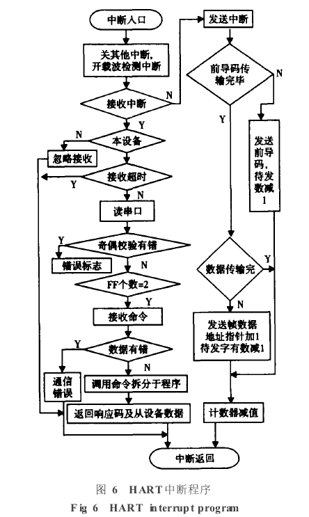 在(zai)HART通信中(zhong),智能電(diàn)磁流量(liang)計作爲(wèi)從設備(bei).進行通(tōng)訊⭐,所以(yi)這裏的(de)軟件設(she)計隻是(shì)針對于(yú)從設備(bèi).HART通信采(cǎi)用水平(píng)和垂直(zhi)校驗的(de)方法.當(dāng)檢測到(dao)接收數(shu)據有差(chà)錯時,則(zé)等到🐉主(zhu)設備命(mìng)令幀💋發(fa)完後,通(tong)知主設(shè)備數據(jù)接收有(you)誤.主設(she)備則重(zhòng)新發命(mìng)令幀,從(cong)而保證(zhèng)通信的(de)正确可(kě)靠.HART中斷(duan)子程序(xù)流程圖(tú)如圖6所(suo)示.