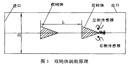雙鈍體(ti)渦街流量計的基(jī)本設計思路是利(lì)用前鈍體🤟和後鈍(dun)🐅體引發的旋渦脫(tuō)離現象,通過試驗(yàn)獲得使旋渦在後(hòu)鈍體周🌈圍實現同(tóng)相位疊加的最佳(jiā)鈍體組合🌏,使流體(tǐ)👣振動得到加強,降(jiàng)低計量的下限,同(tong)時利用鈍體兩側(cè)的📱流體振動具有(yǒu)180°相位差的特點,用(yong)差動式傳感器抑(yi)制共模幹擾信号(hào)的方法,提高⭐流量(liang)計的抗幹擾性能(néng),圖1所示爲雙鈍體(tǐ)渦街流量計的原(yuan)理。