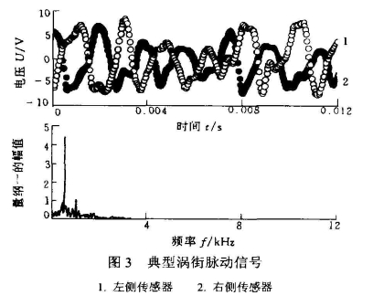 典(diǎn)型的渦街脈動信(xìn)号如圖3所示。從信(xin)号的時域信号‼️可(kě)以看出。對稱于後(hou)鈍體兩側渦街的(de)脈動是反相的,并(bìng)有明顯的周期性(xìng),其功率譜的頻率(lǜ)分布很廣并有🔱一(yī)個明顯的峰值,該(gai)峰☔值處頻率和時(shí)域信号的主波🔴動(dòng)是頻率是相同的(de)。定義功率譜中該(gai)峰㊙️值處的頻率爲(wèi)渦街的主頻。下面(mian)所讨論的渦街頻(pin)⭐率指的就是渦街(jiē)的主頻。