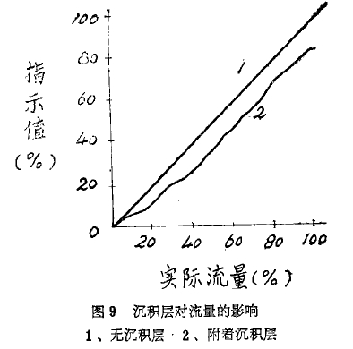 我們(men)還未碰到過(guo)附着沉積層(ceng)影響流量指(zhǐ)示值的實例(lì),因此沒有試(shi)驗與驗證。隻(zhī)看到資料上(shàng)的一個實例(lì),發送器口徑(jing)150毫米,沉積層(ceng)厚度3毫米,有(you)無沉積層二(er)種惰況下流(liú)測量定值示(shì)于圖9。