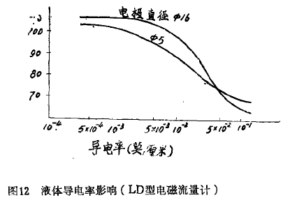 對于(yú)配有EWY型電位(wèi)差計(經改裝(zhuāng)過)的LD型電磁(cí)流量計老産(chan)品由于測量(liàng)線路的輸入(rù)阻抗較小(Rr≈3兆(zhao)歐),當導電率(lǜ)超過某一數(shù)值時,會降低(dī)流量訊号而(er)改變了流量(liàng)指示值。我們(men)也曾用第六(liu)節所述相同(tong)的食鹽水,對(dui)LD--25型電磁流量(liàng)計老産品做(zuo)試驗,試驗表(biǎo)明有一定影(yǐng)響,結果示于(yu)圖12。此圖曲線(xiàn)隻能定性地(dì)看總的趨向(xiang),不能取作修(xiū)正系數,因爲(wèi)電極大小、管(guǎn)徑等因素,均(jun)會影響曲線(xiàn)的數值,如用(yòng)過去生産的(de)LD型電磁流量(liàng)計老産品,液(yè)體導電率影(ying)響流量指示(shi)值時,有時候(hòu)可以利用現(xian)場設備重新(xīn)标定,下面介(jiè)紹利用現場(chǎng)設備,實際使(shi)用液體重新(xīn)标定的一個(gè)實例: