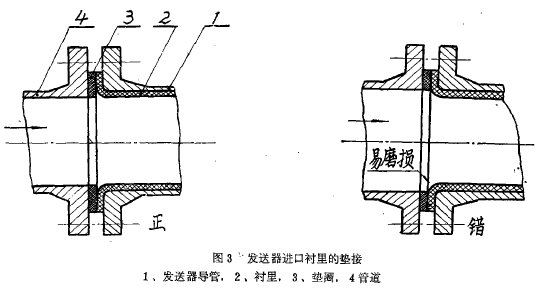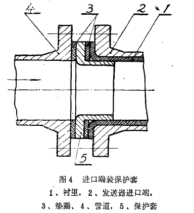 發送器(qì)接上管道時(shí),進口端要避(bi)免如圖3B所示(shì)錯誤的裝法(fa),襯裏口暴露(lù)在液流之中(zhong),使襯裏磨耗(hao)極快,使用日(rì)久,磨損漸向(xiang)内伸,緻使襯(chèn)裏全部破壞(huài)。如按A的方式(shì)就比較好些(xie)。有一使用單(dan)位曾在發送(song)器進口端裝(zhuang)一~金屬保護(hu)套,如圖4所示(shi),先使金屬保(bao)護套抵擋-層(céng),使勿傷襯裏(lǐ),定期掉換,有(yǒu)一定效果。如(rú)果該保護套(tào)采用耐磨性(xing)好上數十倍(bei)的鑄石制作(zuò),那麽防磨損(sǔn)的保護作用(yong)就更爲理想(xiǎng)了。假如發送(song)器導管的襯(chen)裏全部用鑄(zhù)石制造,那末(mò)耐磨問題可(kě)以說完全解(jie)決了,但是目(mu)前制作上還(hái)有一定困難(nán),希望大家一(yī)起想想辦法(fa)。