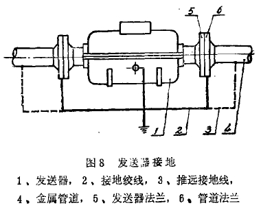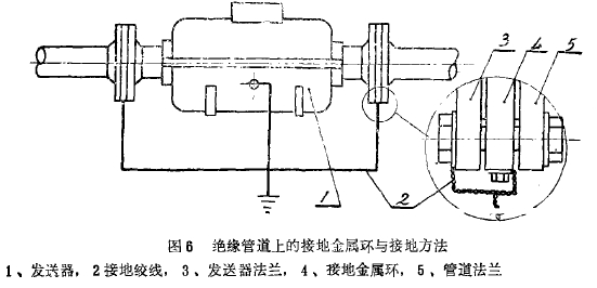 在化工(gong)行業中輸送(sòng)腐蝕性液體(ti)的管道系統(tǒng),往往采用塑(sù)料,玻璃等不(bu)導電材料的(de)管系,液體在(zai)這種管道中(zhong)流動,處于對(dui)地絕緣狀态(tài),斷絕了介質(zhì)接地的參考(kao)電位,使儀表(biǎo)無法正常工(gong)作。因此爲了(le)使流動液體(tǐ)良好接地,必(bi)須如圖6所示(shi)在發送器前(qián)後各接一個(gè)接地金屬環(huan)或--小段金屬(shu)管,使發送器(qì)前後二段的(de)液體接地,以(yǐ)排除幹擾。這(zhe)方面的教訓(xùn)是很多的,下(xia)文第3一3節還(hái)有較詳細的(de)說明。