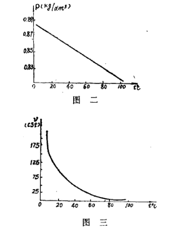 30#機油(yóu)的ρ(密度(du))一t℃(溫度(du))及v(運動(dòng)學粘度(dù))-t℃的曲線(xian)分别見(jiàn)圖二、圖(tu)三。