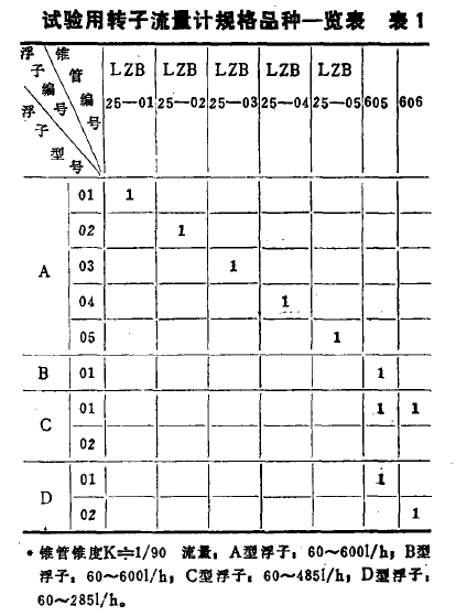 試驗(yan)用轉子(zǐ)流量計(ji)的規格(gé)品種見(jiàn)表1。