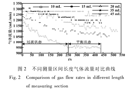 由圖2可以(yi)看出,每一(yi)條曲線都(dōu)對應兩種(zhǒng)狀态,一種(zhong)🤩是平衡狀(zhuang)🐆态,即時間(jiān)足夠長,所(suǒ)測流量達(dá)到一個穩(wen)定值,然後(hou)基本保持(chí)不變,在曲(qǔ)線中出現(xiàn)一“平台”;另(lìng)--種爲過渡(dù)狀态,即從(cong)開始測量(liàng)到平衡狀(zhuàng)态之間的(de)💛動态.變化(huà)過程,測量(liàng)🌈曲線中表(biǎo)現爲“下坡(po)”。測量區間(jiān)🥵越短,過渡(du)狀态對應(yīng)時間♊越長(zhang),這種變化(hua)趨勢越緩(huǎn)慢。由10mL和15mL曲(qǔ)線可以看(kan)出,這種緩(huan)🌏慢變化出(chū)現的“階梯(ti)”現象,達到(dào)平衡狀✍️态(tài)後,對應的(de)流量🐆值較(jiào)大。測量區(qū)間越長,過(guo)渡狀态經(jing)曆的時間(jian)越短,曲線(xian)越陡,35mL和45mL曲(qǔ)線出現明(ming)顯的下滑(huá)态勢,很快(kuai)趨于平衡(héng)狀态。穩定(ding)後對應的(de)測量值較(jiào)小。同樣的(de)氣源氣量(liang),由于測量(liàng)🤩區間長度(dù)的變化,會(huì)導緻穩定(dìng)後的測量(liang)值出現誤(wu)差。